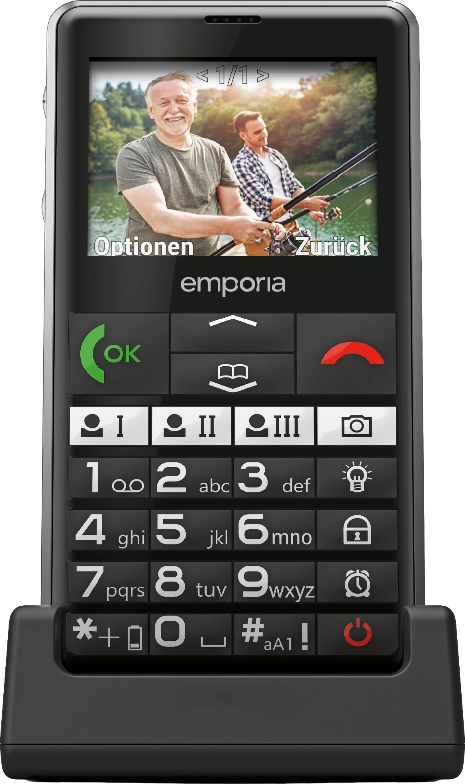 Und das ist längst nicht alles, was dieses Seniorenhandy, das auch kompatibel mit Hörgeräten (HAC M4/T4) ist, mitbringt: Das große Farbdisplay bietet beispielsweise noch genügend Platz für die übersichtliche Darstellung aller Informationen und des Menüs. Die rechte Tastenspalte ermöglicht den direkten Zugriff auf die Taschenlampe, die Kamera und den Wecker. Und ganz unten befindet sich der Ein/Aus-Schalter. Somit ist dieses Seniorenhandy eine perfekte Wahl für alle, die gerne mit Kurzwahltasten arbeiten oder ein Hörgerät tragen.